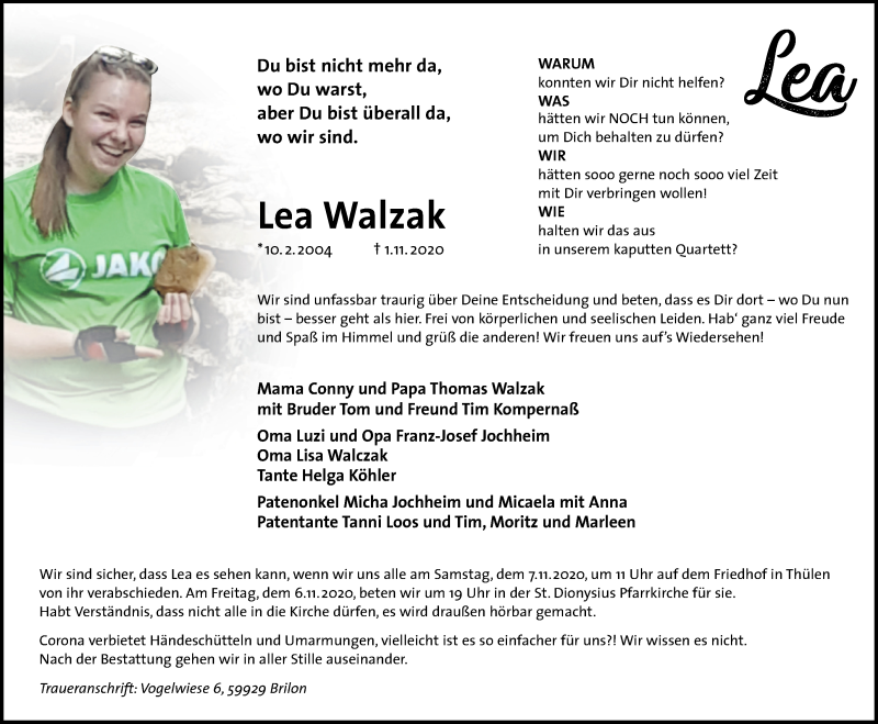 Hier finden Sie alle Traueranzeigen aus der Zeitung, die bisher für Lea Walzak erschienen sind. Weitere Traueranzeigen, die in der Zeitung erscheinen, werden hier ebenfalls aufgelistet