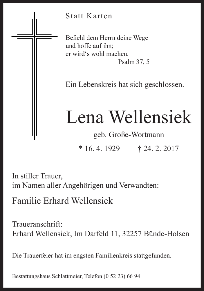 Hier finden Sie alle Traueranzeigen aus der Zeitung, die bisher für Lena Wellensiek erschienen sind. Weitere Traueranzeigen, die in der Zeitung erscheinen, werden hier ebenfalls aufgelistet