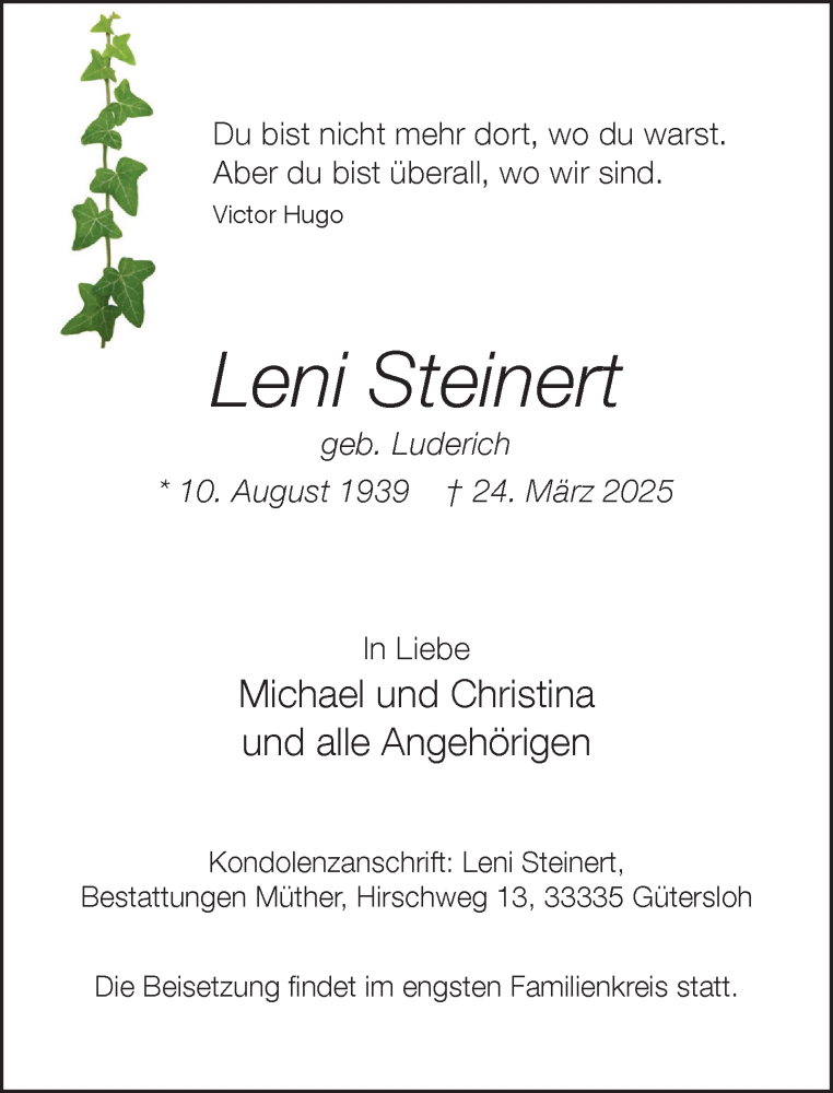 Hier finden Sie alle Traueranzeigen aus der Zeitung, die bisher für Leni Steinert erschienen sind. Weitere Traueranzeigen, die in der Zeitung erscheinen, werden hier ebenfalls aufgelistet