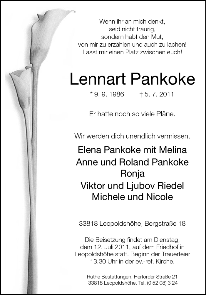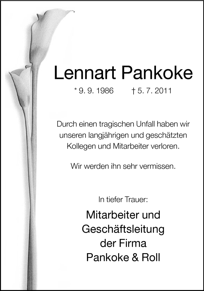 Hier finden Sie alle Traueranzeigen aus der Zeitung, die bisher für Lennart Pankoke erschienen sind. Weitere Traueranzeigen, die in der Zeitung erscheinen, werden hier ebenfalls aufgelistet