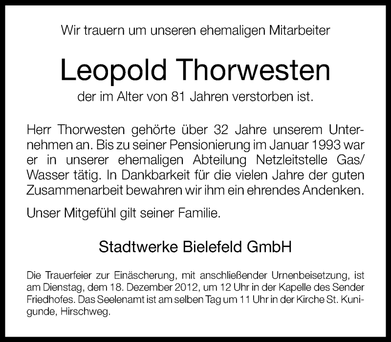 Hier finden Sie alle Traueranzeigen aus der Zeitung, die bisher für Leopold Thorwesten erschienen sind. Weitere Traueranzeigen, die in der Zeitung erscheinen, werden hier ebenfalls aufgelistet