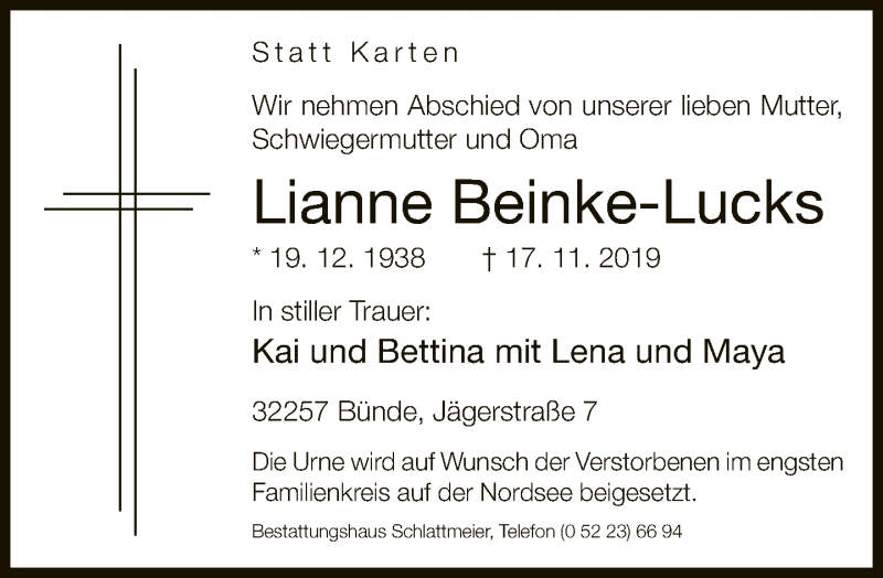 Hier finden Sie alle Traueranzeigen aus der Zeitung, die bisher für Lianne Beinke-Lucks erschienen sind. Weitere Traueranzeigen, die in der Zeitung erscheinen, werden hier ebenfalls aufgelistet
