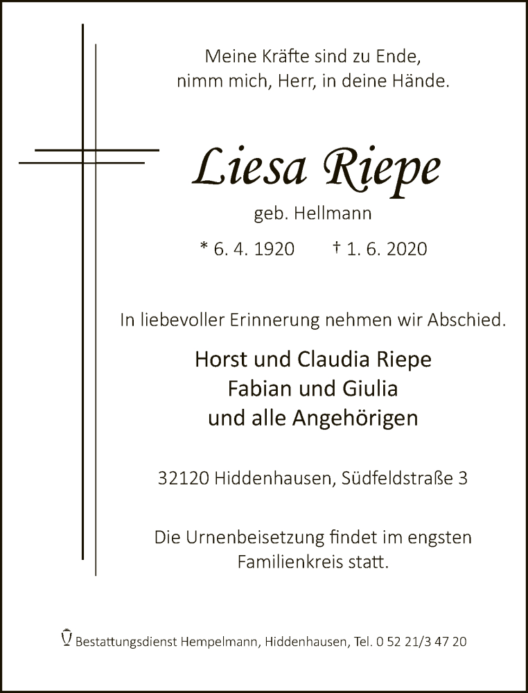 Hier finden Sie alle Traueranzeigen aus der Zeitung, die bisher für Liesa Riepe erschienen sind. Weitere Traueranzeigen, die in der Zeitung erscheinen, werden hier ebenfalls aufgelistet