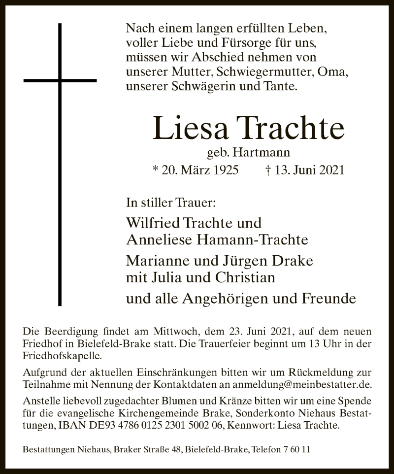 Hier finden Sie alle Traueranzeigen aus der Zeitung, die bisher für Liesa Trachte erschienen sind. Weitere Traueranzeigen, die in der Zeitung erscheinen, werden hier ebenfalls aufgelistet