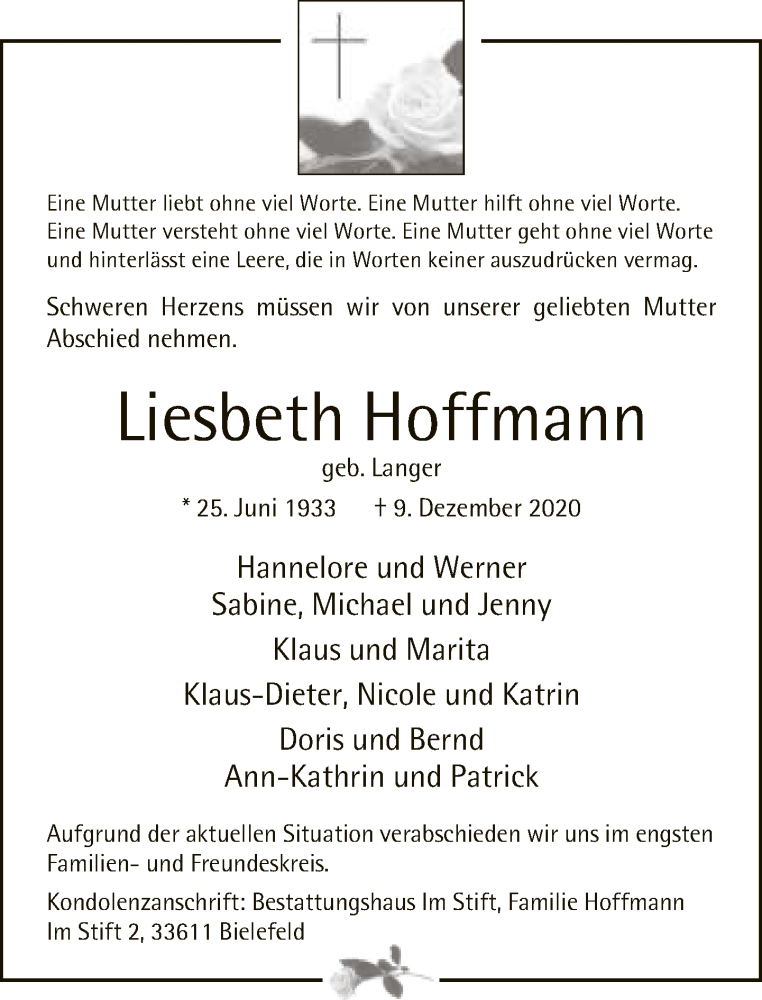 Hier finden Sie alle Traueranzeigen aus der Zeitung, die bisher für Liesbeth Hoffmann erschienen sind. Weitere Traueranzeigen, die in der Zeitung erscheinen, werden hier ebenfalls aufgelistet