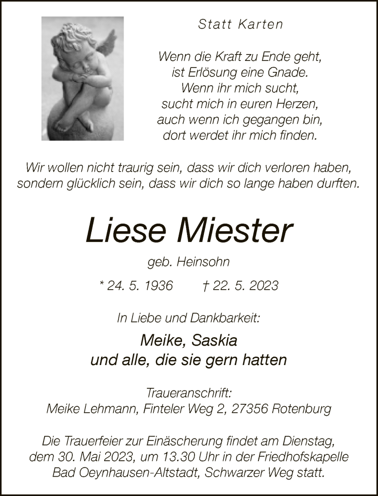 Hier finden Sie alle Traueranzeigen aus der Zeitung, die bisher für Liese Miester erschienen sind. Weitere Traueranzeigen, die in der Zeitung erscheinen, werden hier ebenfalls aufgelistet