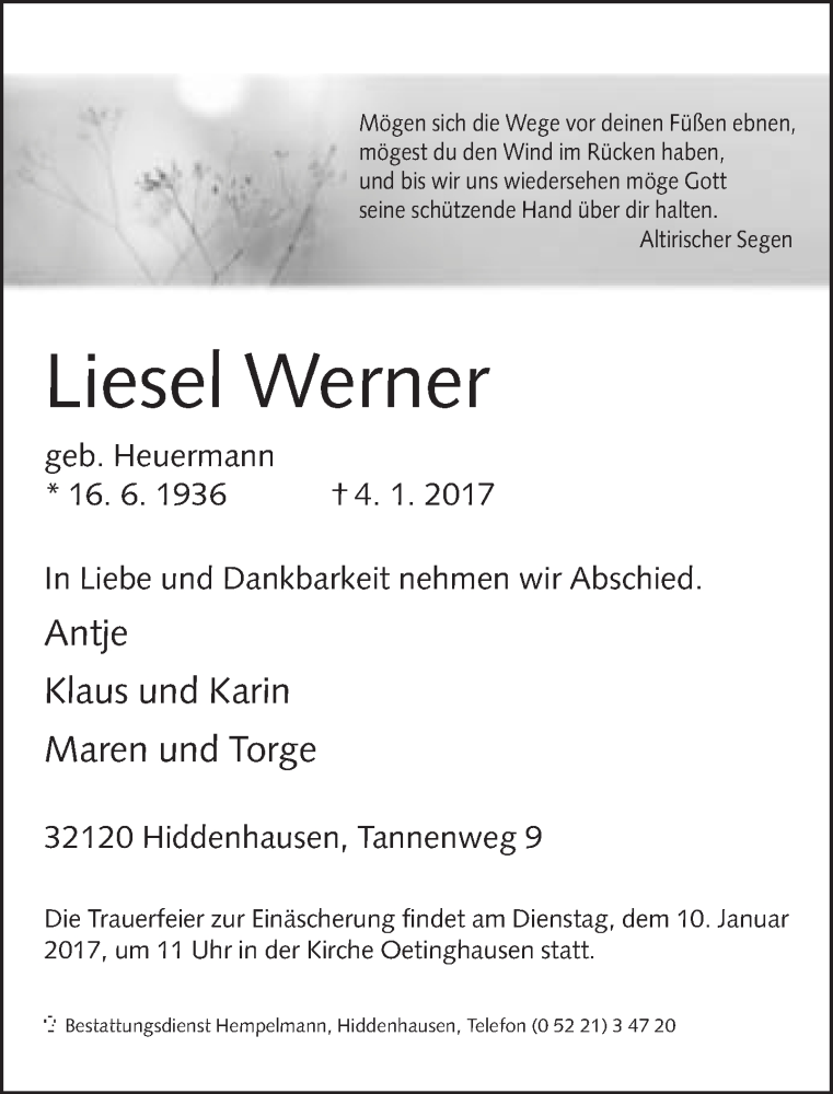 Hier finden Sie alle Traueranzeigen aus der Zeitung, die bisher für Liesel Werner erschienen sind. Weitere Traueranzeigen, die in der Zeitung erscheinen, werden hier ebenfalls aufgelistet