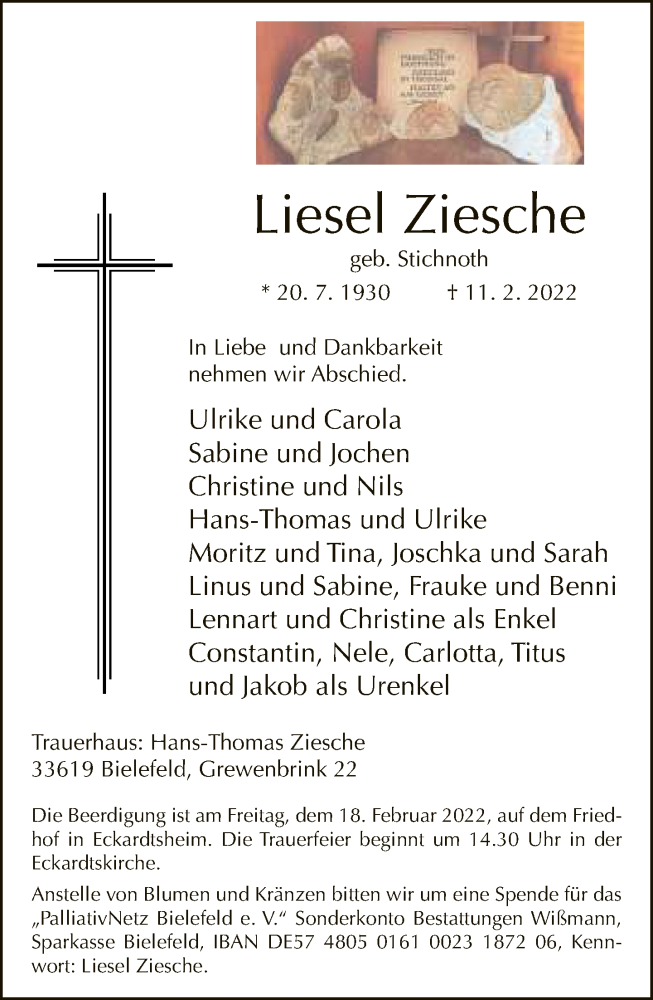 Hier finden Sie alle Traueranzeigen aus der Zeitung, die bisher für Liesel Ziesche erschienen sind. Weitere Traueranzeigen, die in der Zeitung erscheinen, werden hier ebenfalls aufgelistet