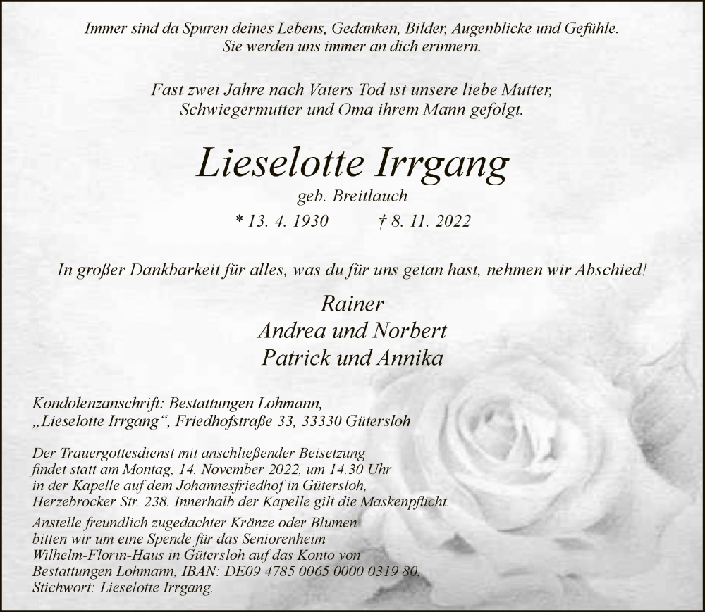 Hier finden Sie alle Traueranzeigen aus der Zeitung, die bisher für Lieselotte Irrgang erschienen sind. Weitere Traueranzeigen, die in der Zeitung erscheinen, werden hier ebenfalls aufgelistet