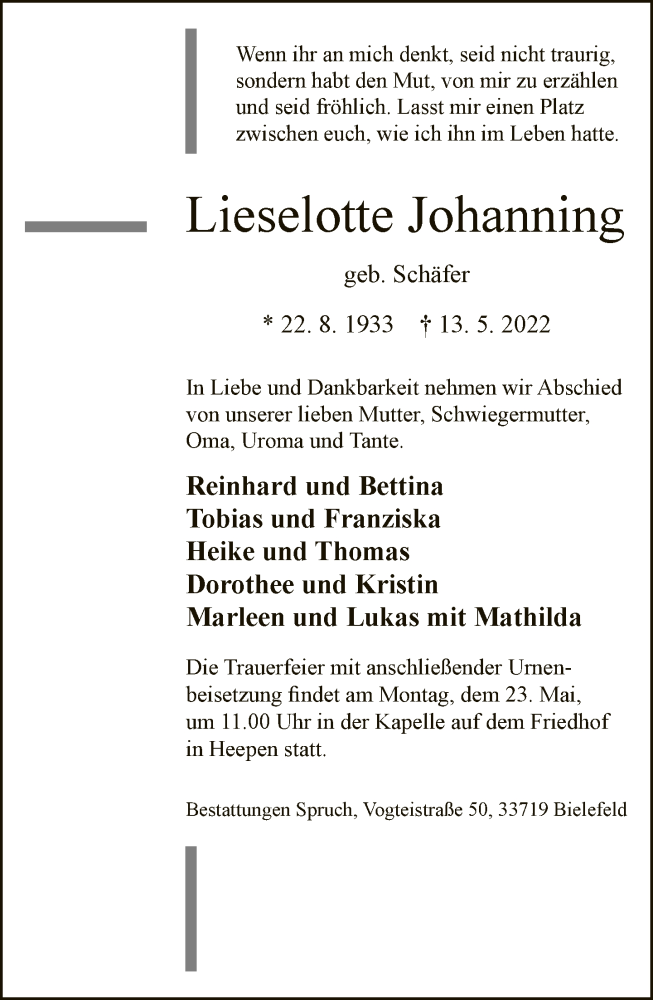 Hier finden Sie alle Traueranzeigen aus der Zeitung, die bisher für Lieselotte Johanning erschienen sind. Weitere Traueranzeigen, die in der Zeitung erscheinen, werden hier ebenfalls aufgelistet