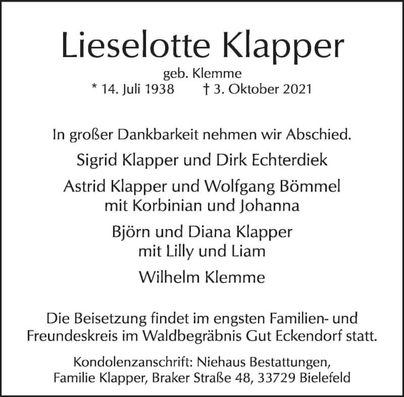 Hier finden Sie alle Traueranzeigen aus der Zeitung, die bisher für Lieselotte Klapper erschienen sind. Weitere Traueranzeigen, die in der Zeitung erscheinen, werden hier ebenfalls aufgelistet