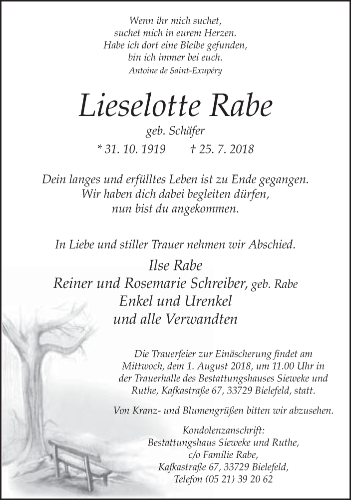 Hier finden Sie alle Traueranzeigen aus der Zeitung, die bisher für Lieselotte Rabe erschienen sind. Weitere Traueranzeigen, die in der Zeitung erscheinen, werden hier ebenfalls aufgelistet