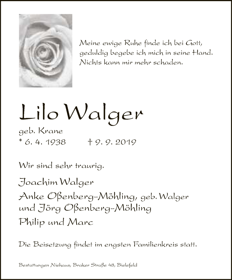 Hier finden Sie alle Traueranzeigen aus der Zeitung, die bisher für Lilo Walger erschienen sind. Weitere Traueranzeigen, die in der Zeitung erscheinen, werden hier ebenfalls aufgelistet
