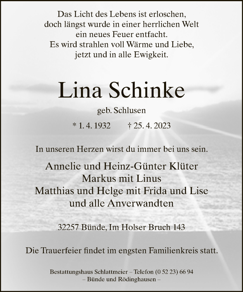 Hier finden Sie alle Traueranzeigen aus der Zeitung, die bisher für Lina Schinke erschienen sind. Weitere Traueranzeigen, die in der Zeitung erscheinen, werden hier ebenfalls aufgelistet