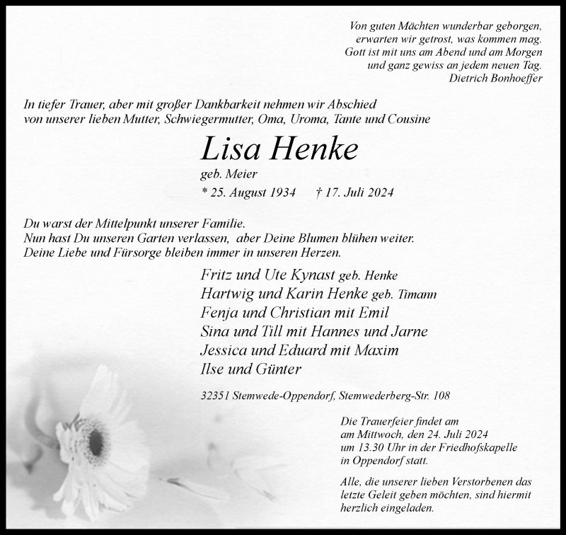 Hier finden Sie alle Traueranzeigen aus der Zeitung, die bisher für Lisa Henke erschienen sind. Weitere Traueranzeigen, die in der Zeitung erscheinen, werden hier ebenfalls aufgelistet