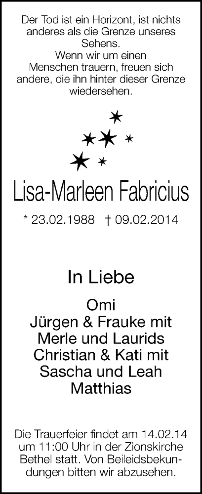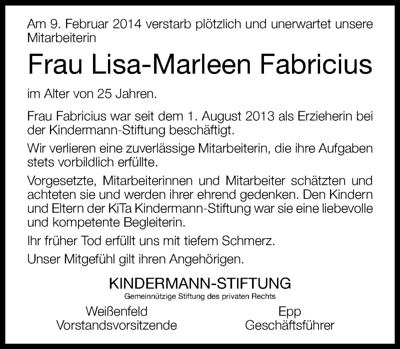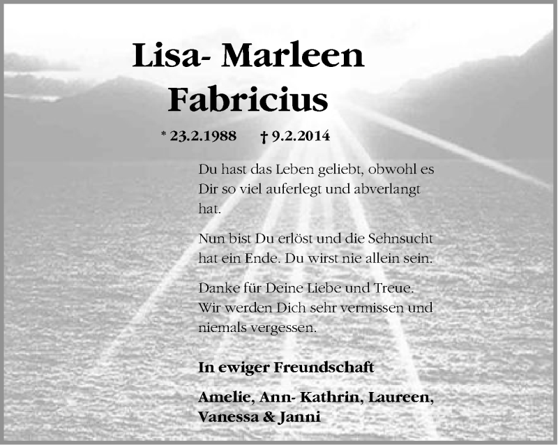 Hier finden Sie alle Traueranzeigen aus der Zeitung, die bisher für Lisa-Marleen Fabricius erschienen sind. Weitere Traueranzeigen, die in der Zeitung erscheinen, werden hier ebenfalls aufgelistet