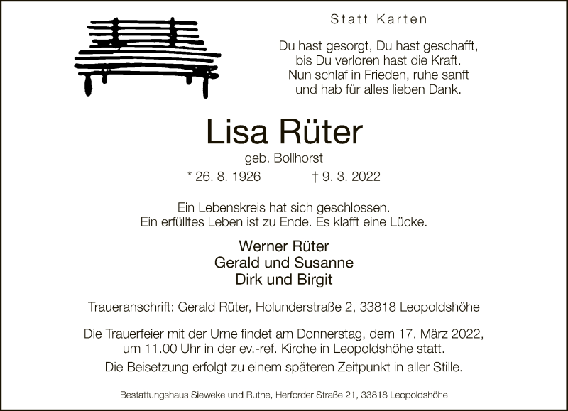 Hier finden Sie alle Traueranzeigen aus der Zeitung, die bisher für Lisa Rüter erschienen sind. Weitere Traueranzeigen, die in der Zeitung erscheinen, werden hier ebenfalls aufgelistet