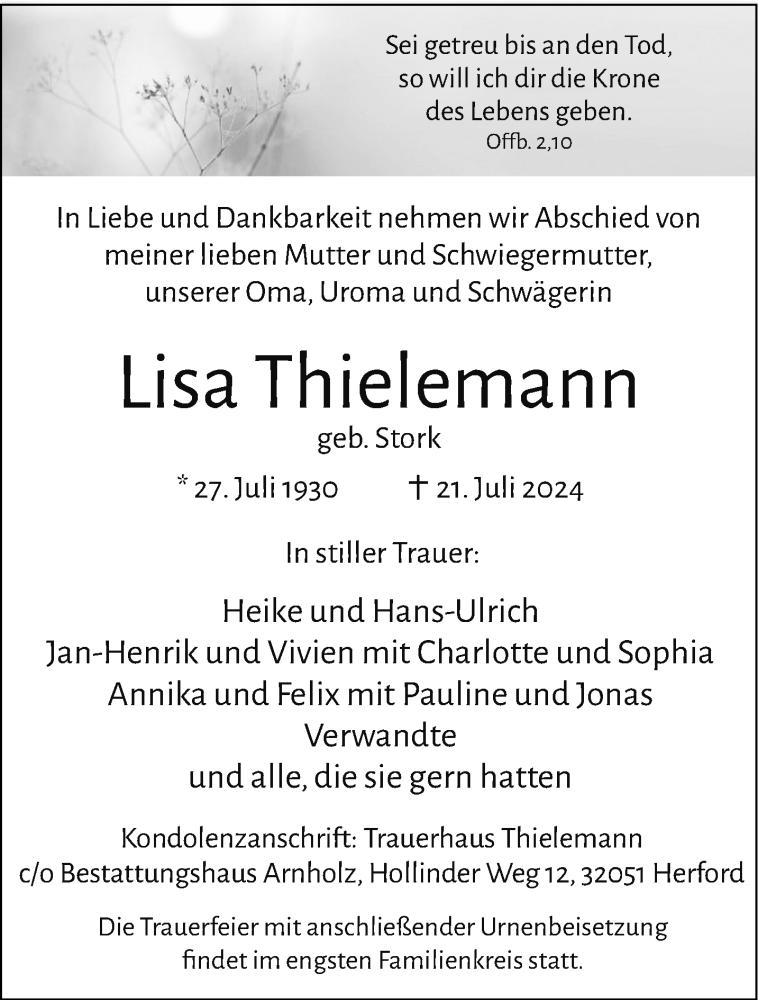 Hier finden Sie alle Traueranzeigen aus der Zeitung, die bisher für Lisa Thielemann erschienen sind. Weitere Traueranzeigen, die in der Zeitung erscheinen, werden hier ebenfalls aufgelistet