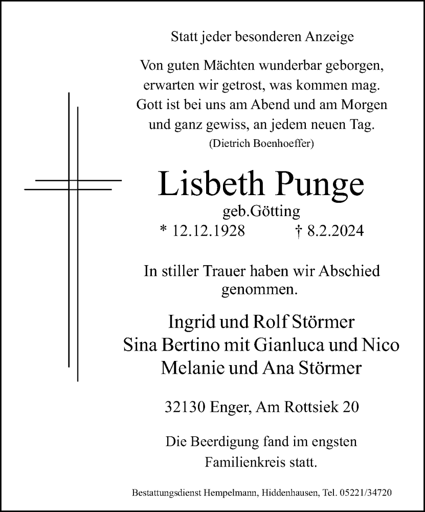 Hier finden Sie alle Traueranzeigen aus der Zeitung, die bisher für Lisbeth Punge erschienen sind. Weitere Traueranzeigen, die in der Zeitung erscheinen, werden hier ebenfalls aufgelistet