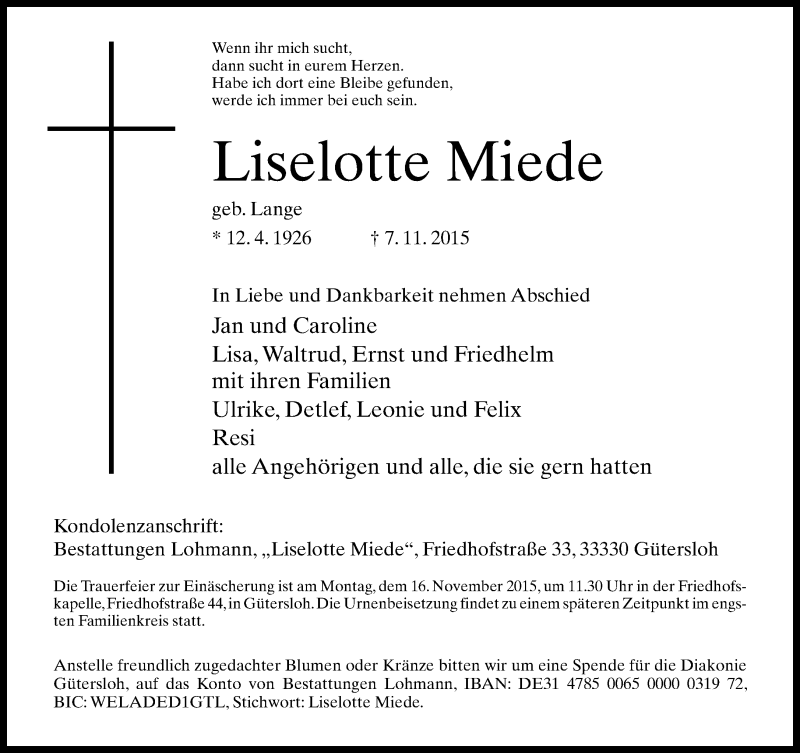Hier finden Sie alle Traueranzeigen aus der Zeitung, die bisher für Liselotte Miede erschienen sind. Weitere Traueranzeigen, die in der Zeitung erscheinen, werden hier ebenfalls aufgelistet