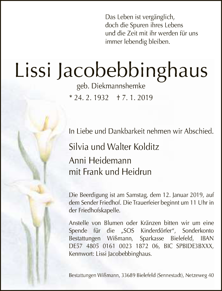 Hier finden Sie alle Traueranzeigen aus der Zeitung, die bisher für Lissi Jacobebbinghaus erschienen sind. Weitere Traueranzeigen, die in der Zeitung erscheinen, werden hier ebenfalls aufgelistet