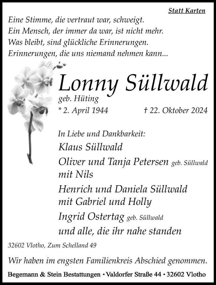 Hier finden Sie alle Traueranzeigen aus der Zeitung, die bisher für Lonny Süllwald erschienen sind. Weitere Traueranzeigen, die in der Zeitung erscheinen, werden hier ebenfalls aufgelistet