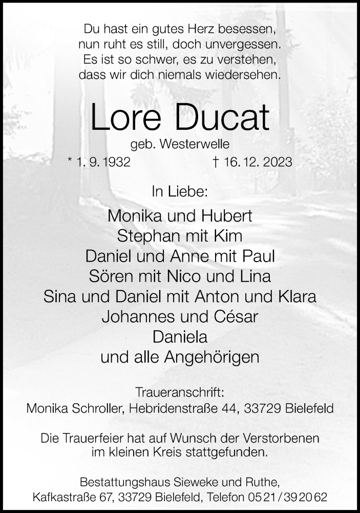 Hier finden Sie alle Traueranzeigen aus der Zeitung, die bisher für Lore Ducat erschienen sind. Weitere Traueranzeigen, die in der Zeitung erscheinen, werden hier ebenfalls aufgelistet