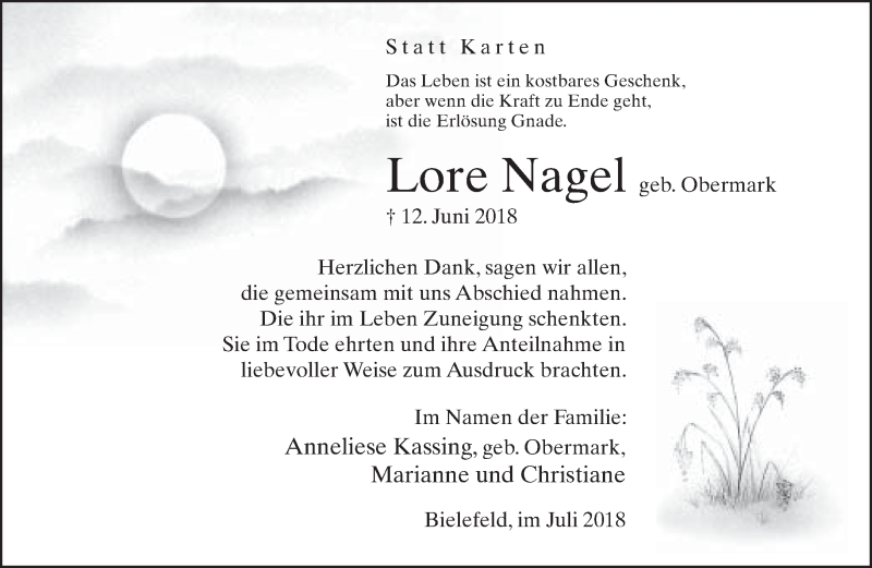 Hier finden Sie alle Traueranzeigen aus der Zeitung, die bisher für Lore Nagel erschienen sind. Weitere Traueranzeigen, die in der Zeitung erscheinen, werden hier ebenfalls aufgelistet