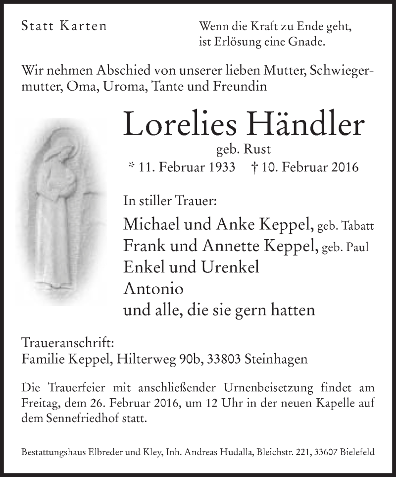 Hier finden Sie alle Traueranzeigen aus der Zeitung, die bisher für Lorelies Händler erschienen sind. Weitere Traueranzeigen, die in der Zeitung erscheinen, werden hier ebenfalls aufgelistet