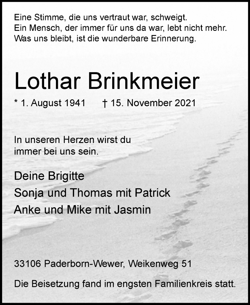 Hier finden Sie alle Traueranzeigen aus der Zeitung, die bisher für Lothar Brinkmeier erschienen sind. Weitere Traueranzeigen, die in der Zeitung erscheinen, werden hier ebenfalls aufgelistet
