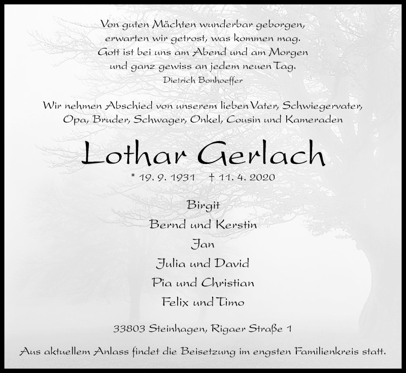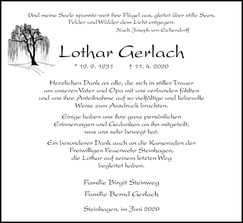 Hier finden Sie alle Traueranzeigen aus der Zeitung, die bisher für Lothar Gerlach erschienen sind. Weitere Traueranzeigen, die in der Zeitung erscheinen, werden hier ebenfalls aufgelistet