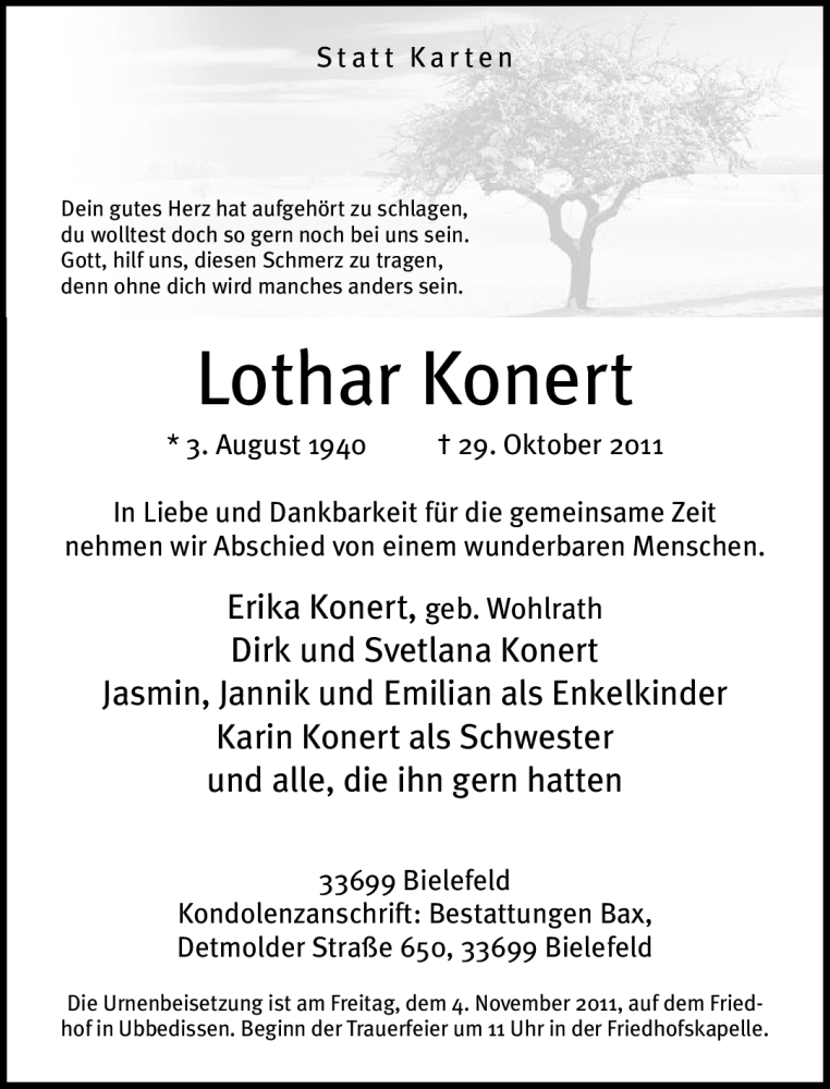 Hier finden Sie alle Traueranzeigen aus der Zeitung, die bisher für Lothar Konert erschienen sind. Weitere Traueranzeigen, die in der Zeitung erscheinen, werden hier ebenfalls aufgelistet
