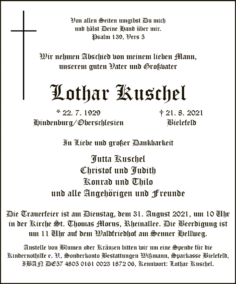 Hier finden Sie alle Traueranzeigen aus der Zeitung, die bisher für Lothar Kuschel erschienen sind. Weitere Traueranzeigen, die in der Zeitung erscheinen, werden hier ebenfalls aufgelistet