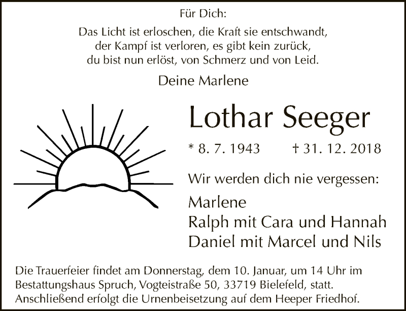 Hier finden Sie alle Traueranzeigen aus der Zeitung, die bisher für Lothar Seeger erschienen sind. Weitere Traueranzeigen, die in der Zeitung erscheinen, werden hier ebenfalls aufgelistet