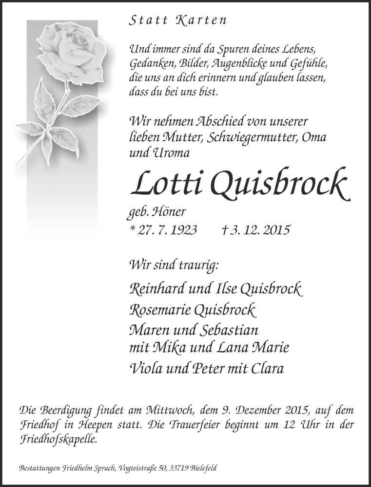 Hier finden Sie alle Traueranzeigen aus der Zeitung, die bisher für Lotti Quisbrock erschienen sind. Weitere Traueranzeigen, die in der Zeitung erscheinen, werden hier ebenfalls aufgelistet