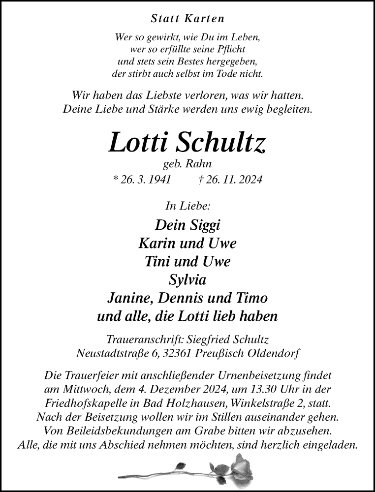Hier finden Sie alle Traueranzeigen aus der Zeitung, die bisher für Lotti Schultz erschienen sind. Weitere Traueranzeigen, die in der Zeitung erscheinen, werden hier ebenfalls aufgelistet