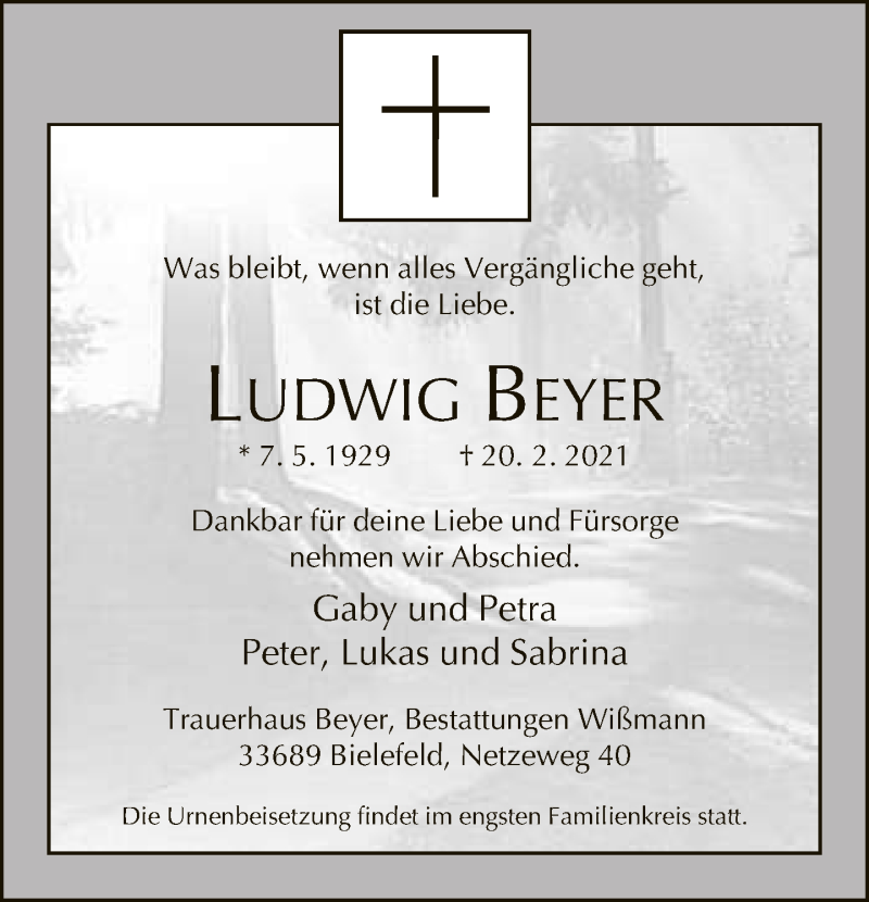 Hier finden Sie alle Traueranzeigen aus der Zeitung, die bisher für Ludwig Beyer erschienen sind. Weitere Traueranzeigen, die in der Zeitung erscheinen, werden hier ebenfalls aufgelistet