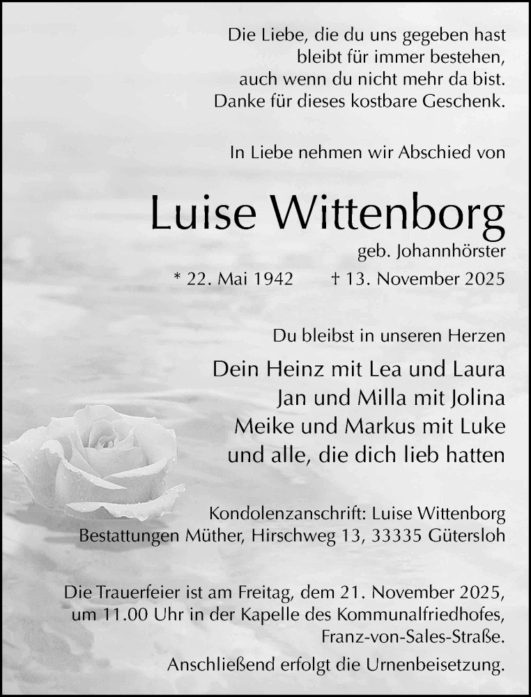 Hier finden Sie alle Traueranzeigen aus der Zeitung, die bisher für Luise Wittenborg erschienen sind. Weitere Traueranzeigen, die in der Zeitung erscheinen, werden hier ebenfalls aufgelistet