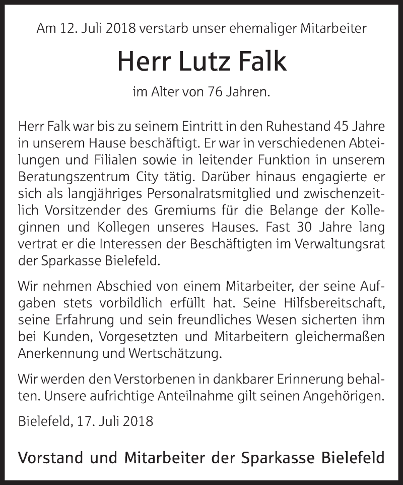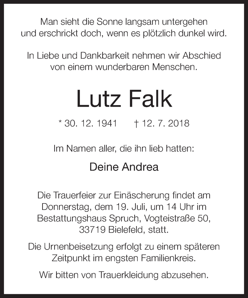 Hier finden Sie alle Traueranzeigen aus der Zeitung, die bisher für Lutz Falk erschienen sind. Weitere Traueranzeigen, die in der Zeitung erscheinen, werden hier ebenfalls aufgelistet
