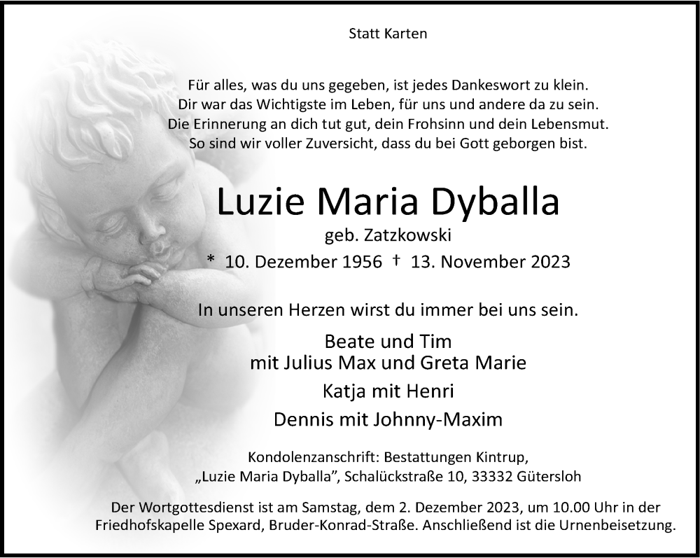 Hier finden Sie alle Traueranzeigen aus der Zeitung, die bisher für Luzie Maria Dyballa erschienen sind. Weitere Traueranzeigen, die in der Zeitung erscheinen, werden hier ebenfalls aufgelistet