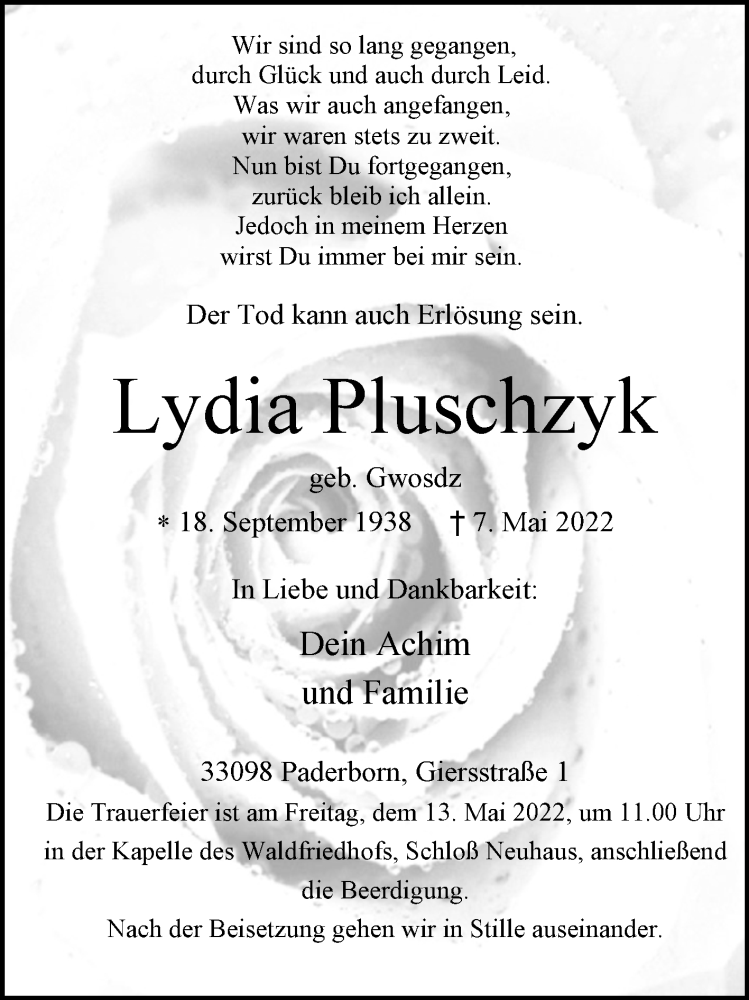 Hier finden Sie alle Traueranzeigen aus der Zeitung, die bisher für Lydia Pluschzyk erschienen sind. Weitere Traueranzeigen, die in der Zeitung erscheinen, werden hier ebenfalls aufgelistet