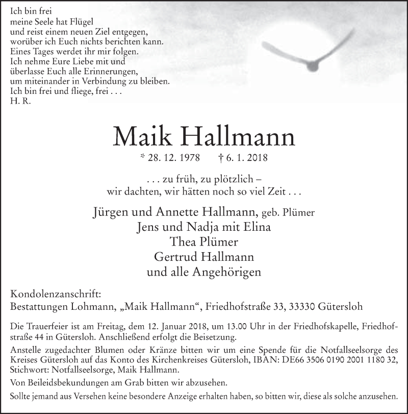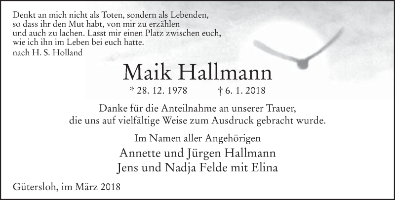 Hier finden Sie alle Traueranzeigen aus der Zeitung, die bisher für Maik Hallmann erschienen sind. Weitere Traueranzeigen, die in der Zeitung erscheinen, werden hier ebenfalls aufgelistet