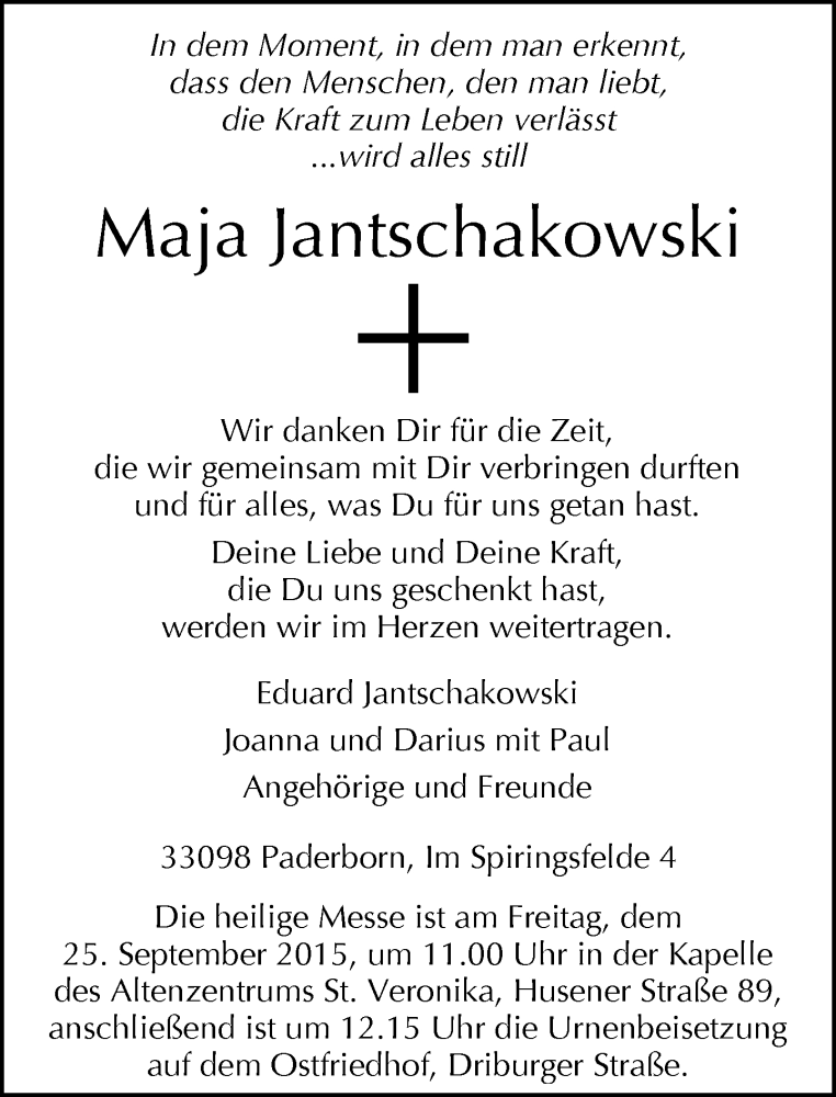 Hier finden Sie alle Traueranzeigen aus der Zeitung, die bisher für Maja Jantschakowski erschienen sind. Weitere Traueranzeigen, die in der Zeitung erscheinen, werden hier ebenfalls aufgelistet