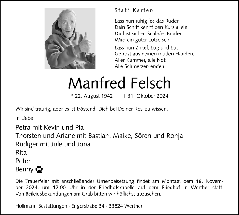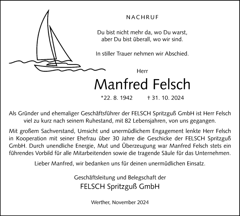 Hier finden Sie alle Traueranzeigen aus der Zeitung, die bisher für Manfred Felsch erschienen sind. Weitere Traueranzeigen, die in der Zeitung erscheinen, werden hier ebenfalls aufgelistet
