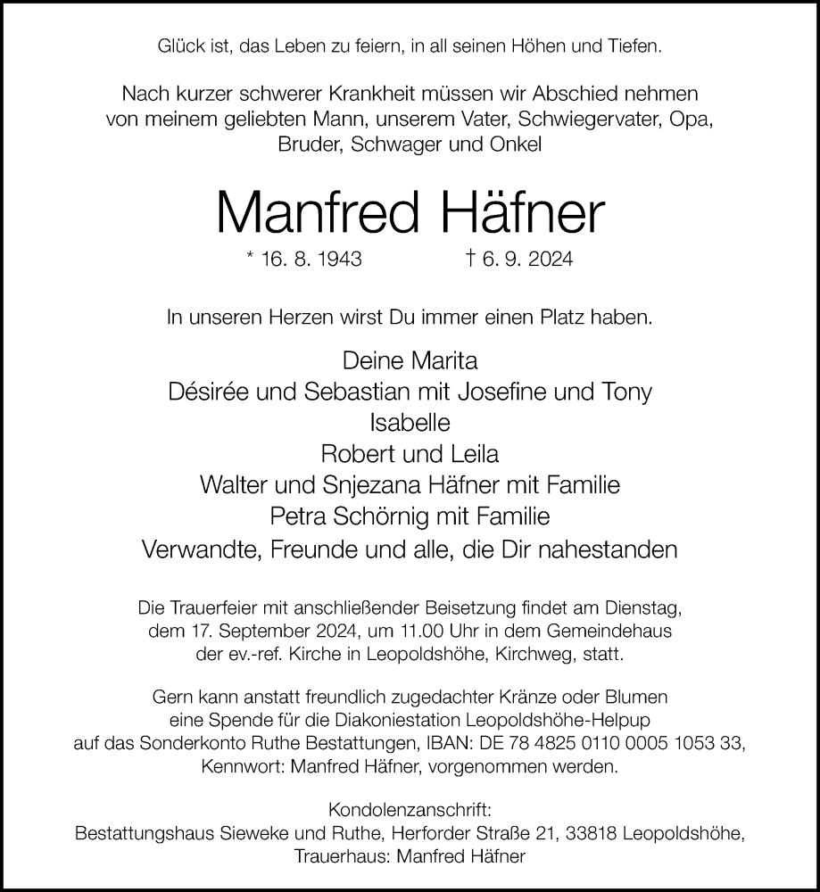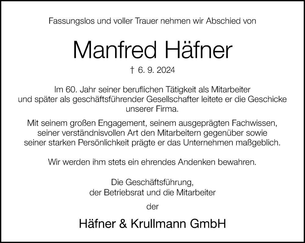 Hier finden Sie alle Traueranzeigen aus der Zeitung, die bisher für Manfred Häfner erschienen sind. Weitere Traueranzeigen, die in der Zeitung erscheinen, werden hier ebenfalls aufgelistet
