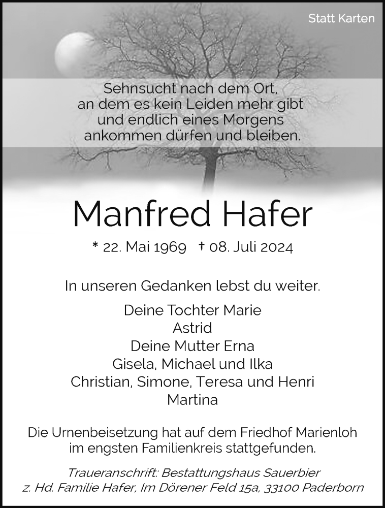 Hier finden Sie alle Traueranzeigen aus der Zeitung, die bisher für Manfred Hafer erschienen sind. Weitere Traueranzeigen, die in der Zeitung erscheinen, werden hier ebenfalls aufgelistet
