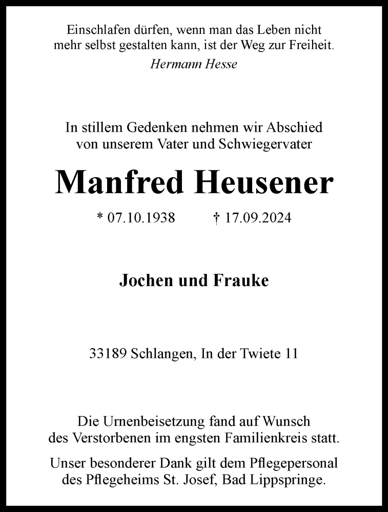 Hier finden Sie alle Traueranzeigen aus der Zeitung, die bisher für Manfred Heusener erschienen sind. Weitere Traueranzeigen, die in der Zeitung erscheinen, werden hier ebenfalls aufgelistet