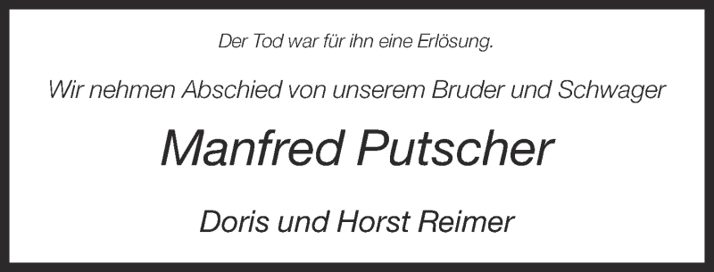 Hier finden Sie alle Traueranzeigen aus der Zeitung, die bisher für Manfred Putscher erschienen sind. Weitere Traueranzeigen, die in der Zeitung erscheinen, werden hier ebenfalls aufgelistet