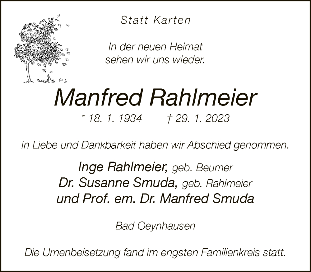 Hier finden Sie alle Traueranzeigen aus der Zeitung, die bisher für Manfred Rahlmeier erschienen sind. Weitere Traueranzeigen, die in der Zeitung erscheinen, werden hier ebenfalls aufgelistet