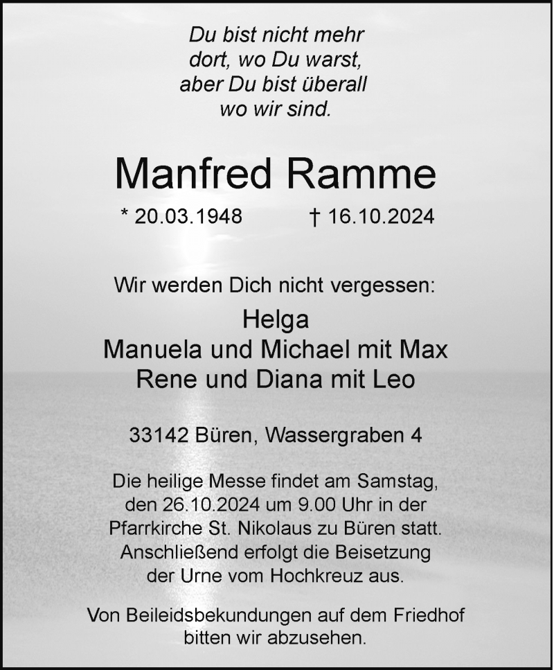 Hier finden Sie alle Traueranzeigen aus der Zeitung, die bisher für Manfred Ramme erschienen sind. Weitere Traueranzeigen, die in der Zeitung erscheinen, werden hier ebenfalls aufgelistet
